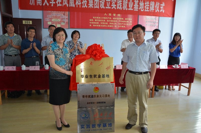致辞结束后,孙卫星副处长与企业领导签署了就业基地协议、梁伟书记与企业领导签署了教学实践基地协议、胡春毅副书记与企业领导签署了青年就业创业见习基地协议。刘迎春书记和燕军副主任共同为“济南大学——凤凰集团”毕业生就业基地、教学实践基地、青年就业创业见习基地正式揭牌剪彩。